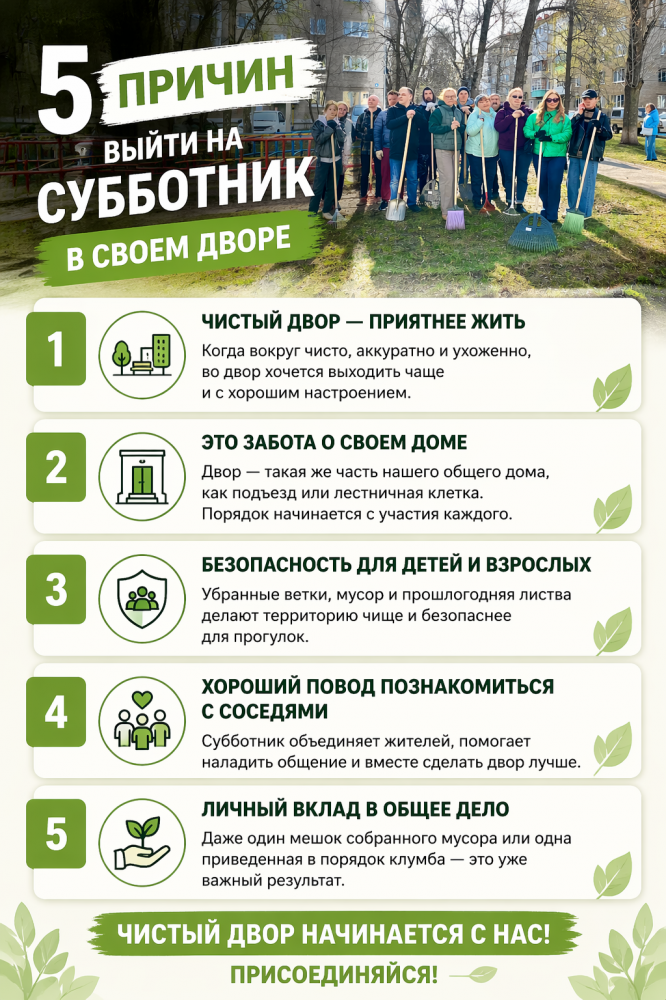 Весна - лучшее время, чтобы вместе навести порядок рядом с домом. Субботник - это не просто уборка, а реальный вклад в комфорт и уют вашего двора.