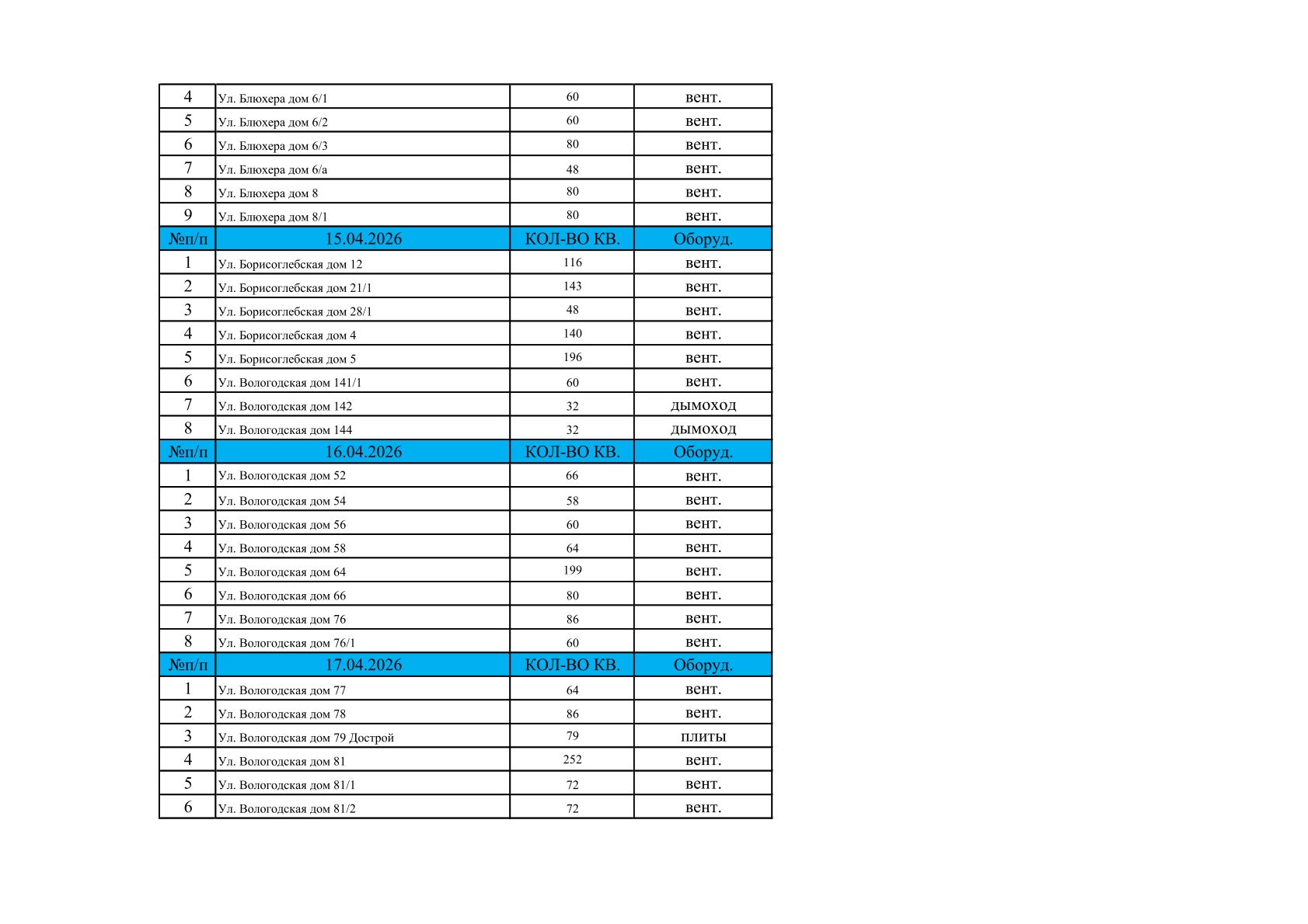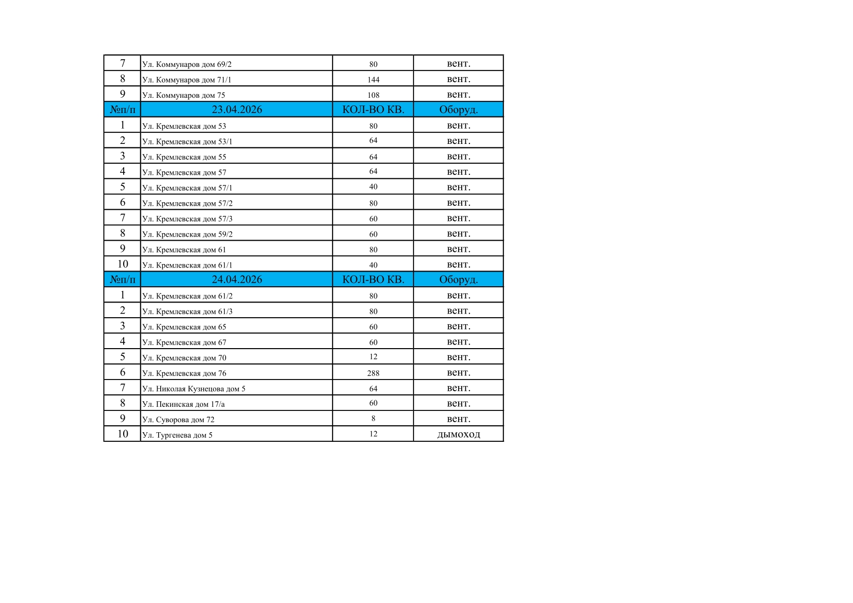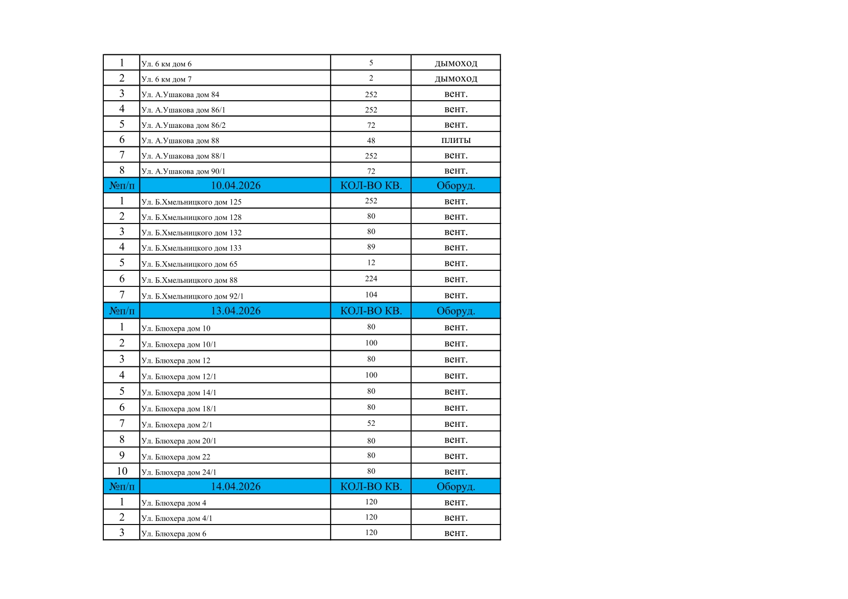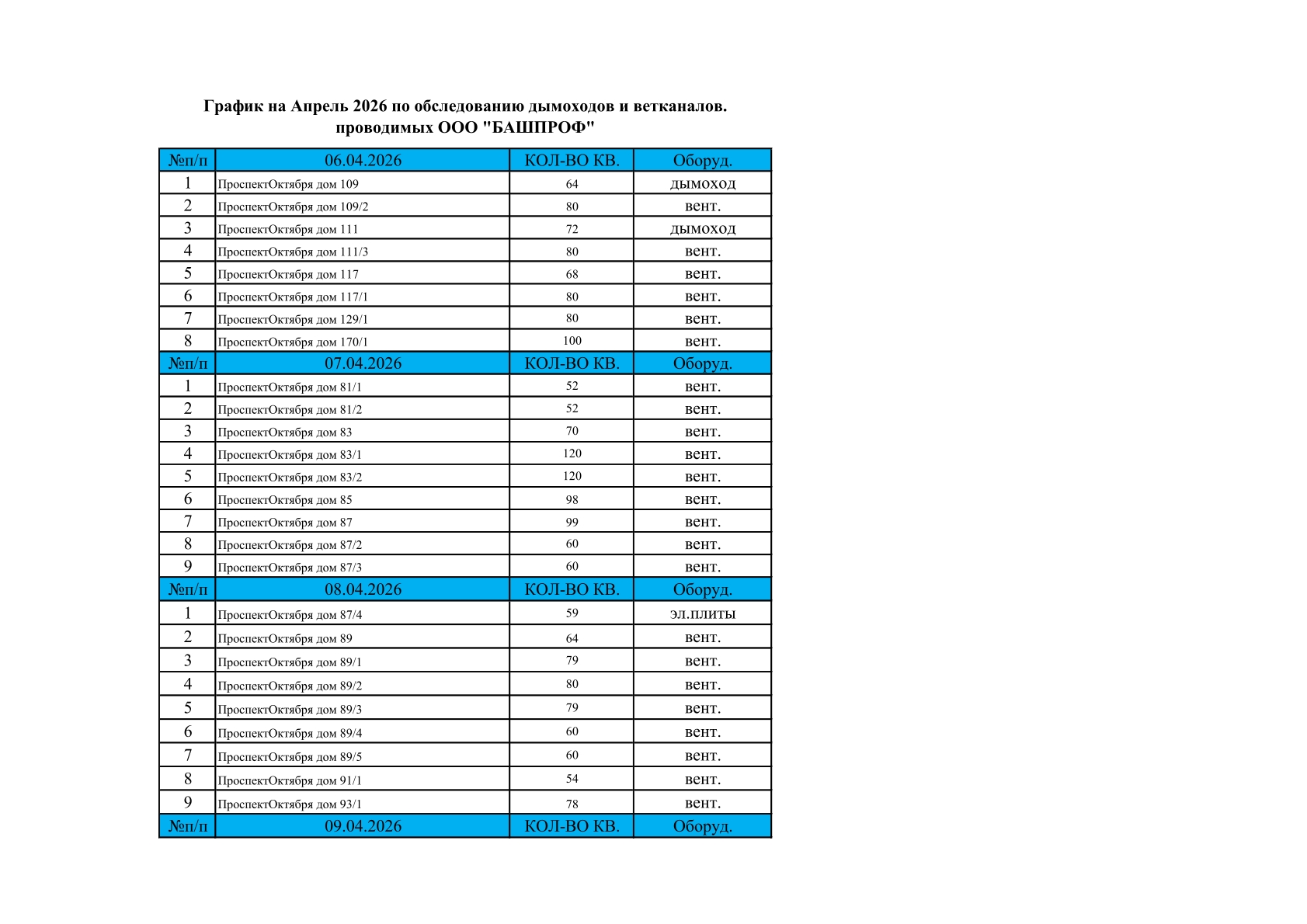 Делимся графиком планового обследования вентиляционных каналов и дымоходов в многоквартирных домах на апрель.