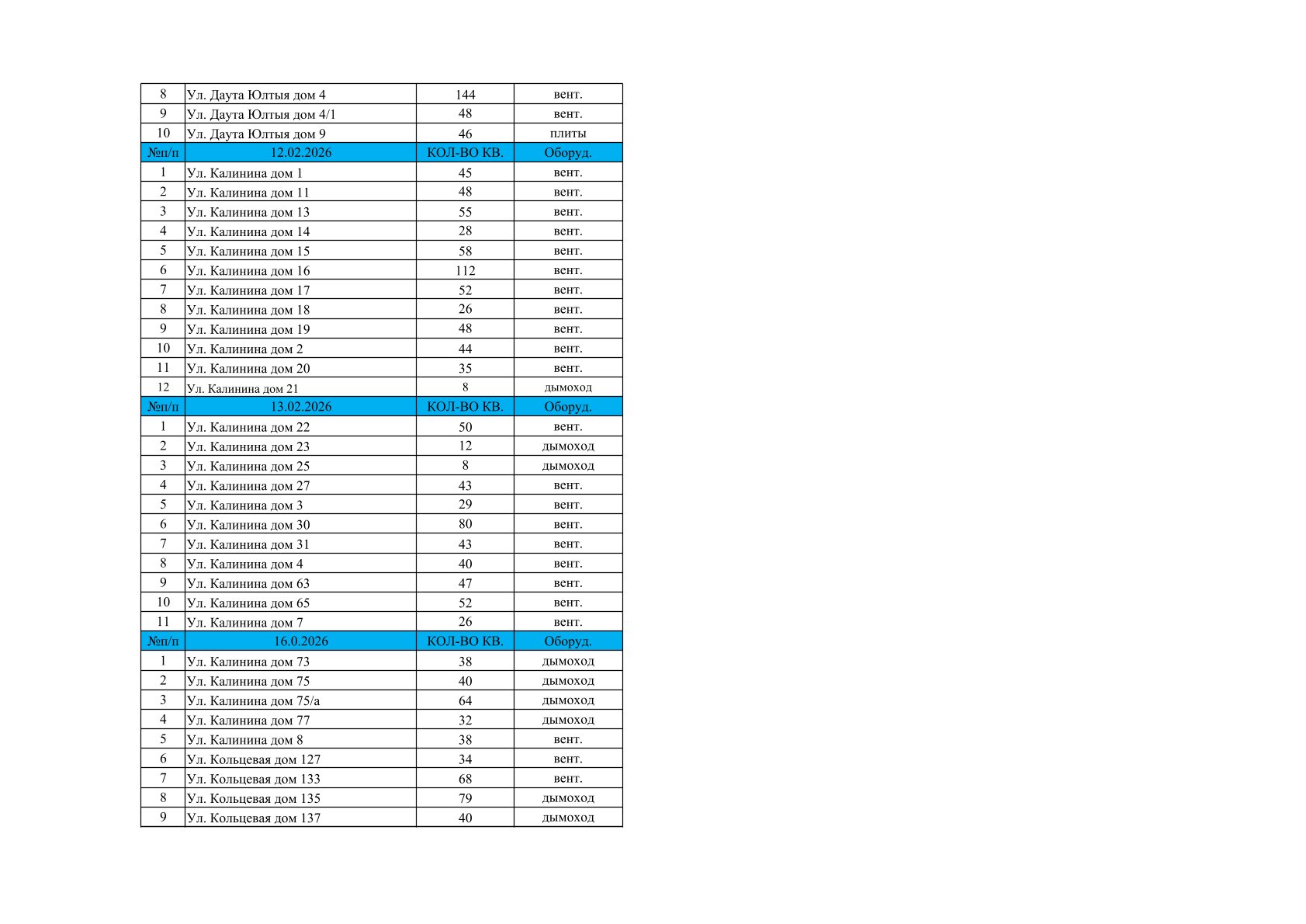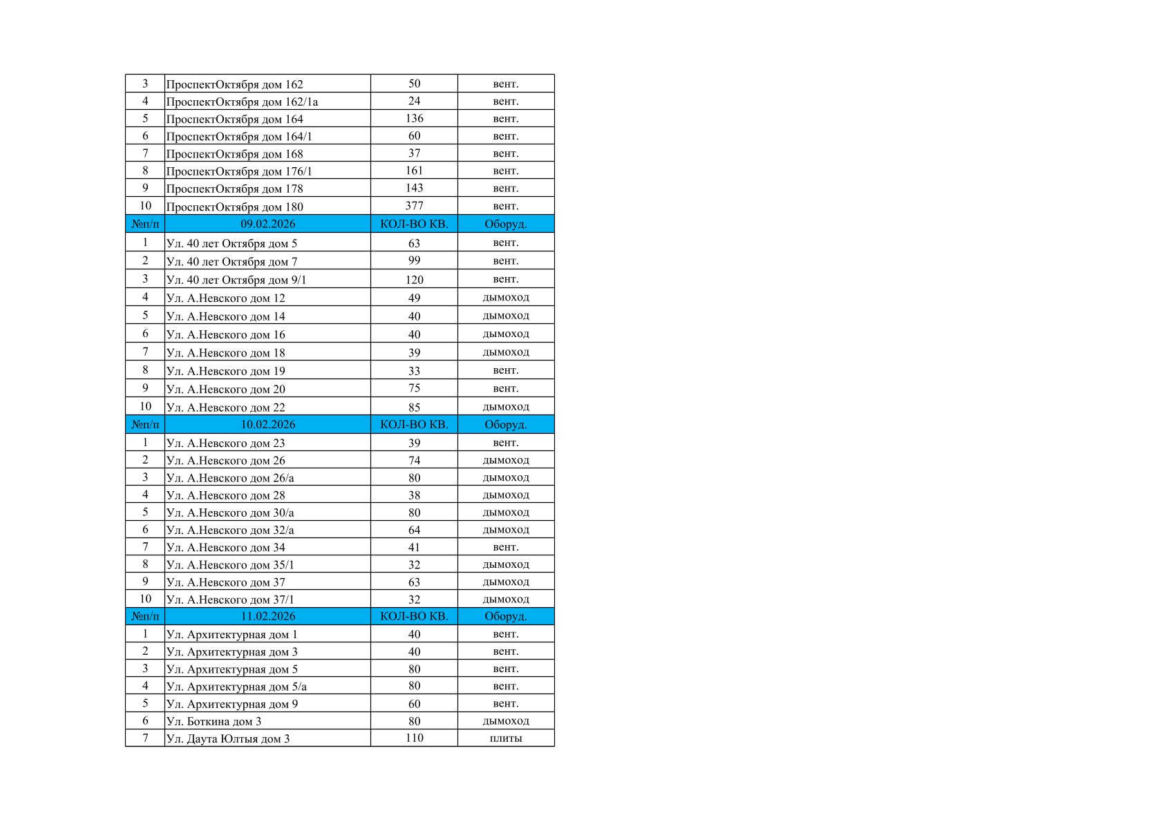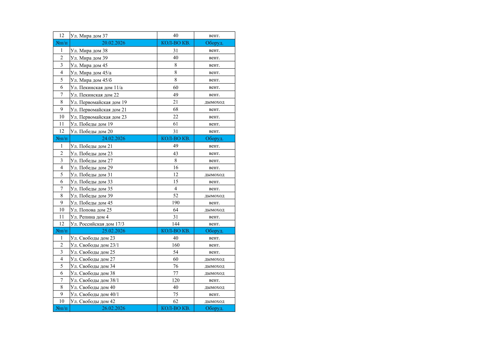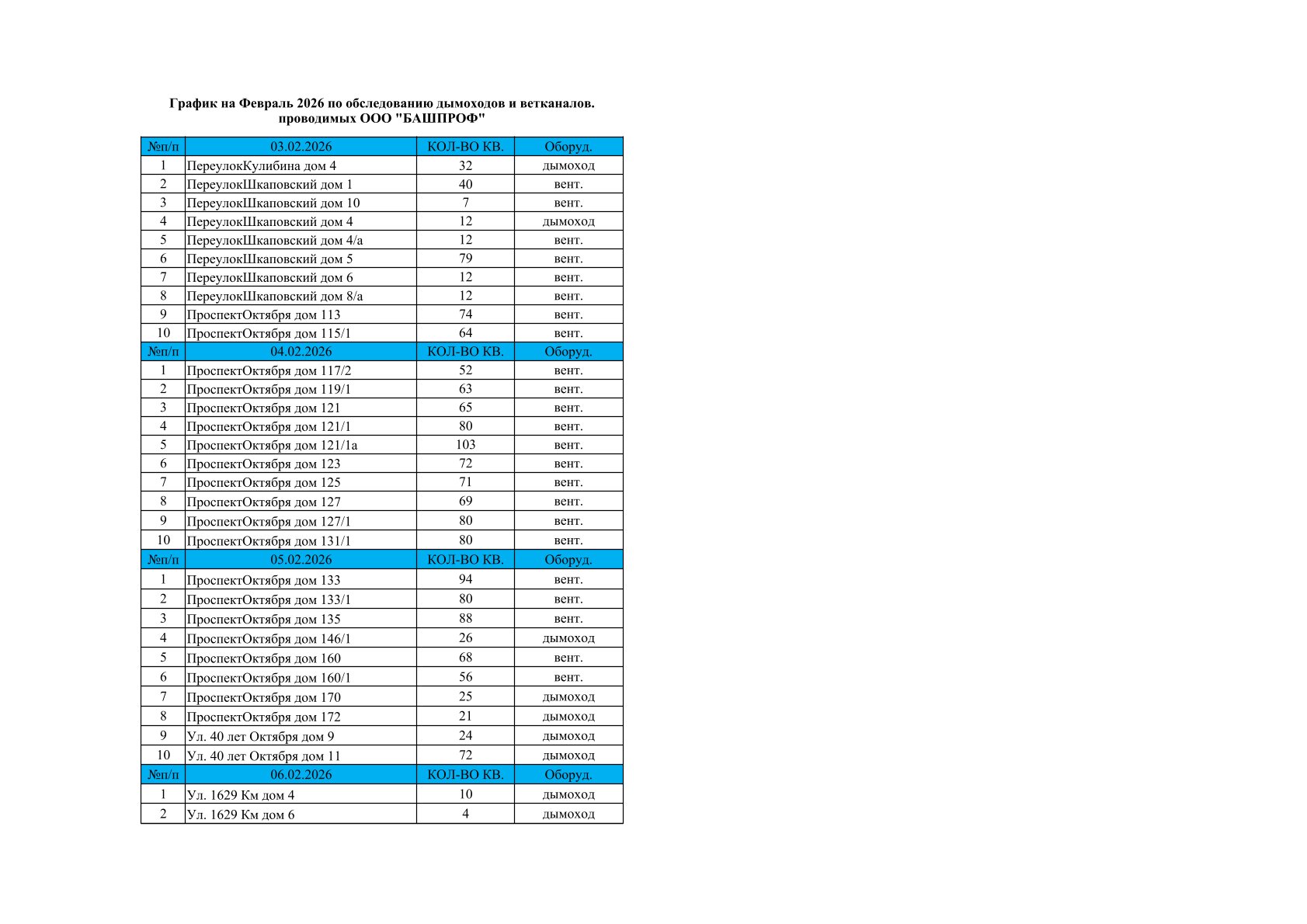 Делимся графиком планового обследования вентиляционных каналов и дымоходов в многоквартирных домах на февраль.
