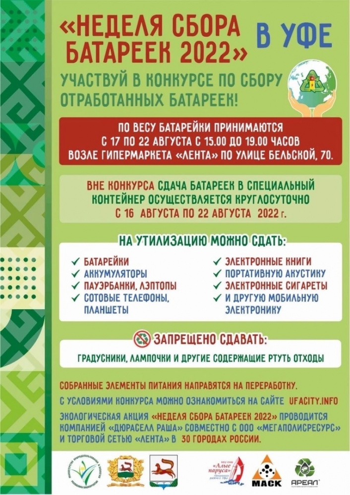 Министерство природопользования и экологии Республики Башкортостан с 16 по 22 августа 2022 года приглашает жителей и гостей города Уфы принять участие в неделе сбора батареек и сдать любое количество отработанных аккумуляторов и электроники в специальной точке приема возле гипермаркета «Лента» на ул. Бельская, 70.