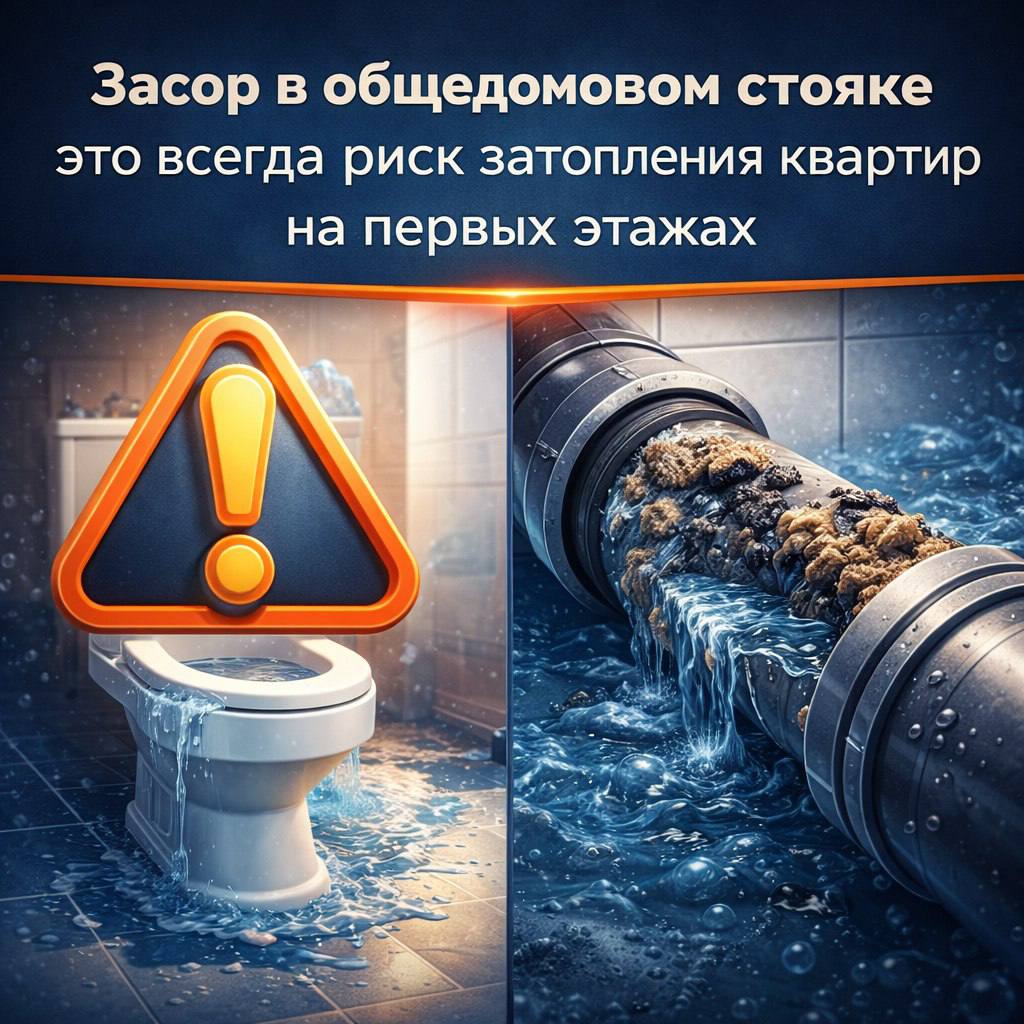 Засор в общедомовом стояке это всегда риск затопления квартир на первых этажах. Когда стокам некуда уходить, они начинают выходить через сантехнику нижних соседей. Это наносит колоссальный ущерб имуществу и требует дорогостоящей дезинфекции.