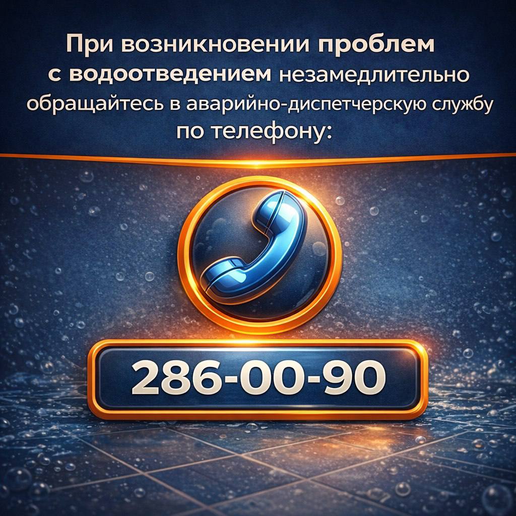 При возникновении проблем с водоотведением незамедлительно обращайтесь в аварийно-диспетчерскую службу по телефону: 286-00-90