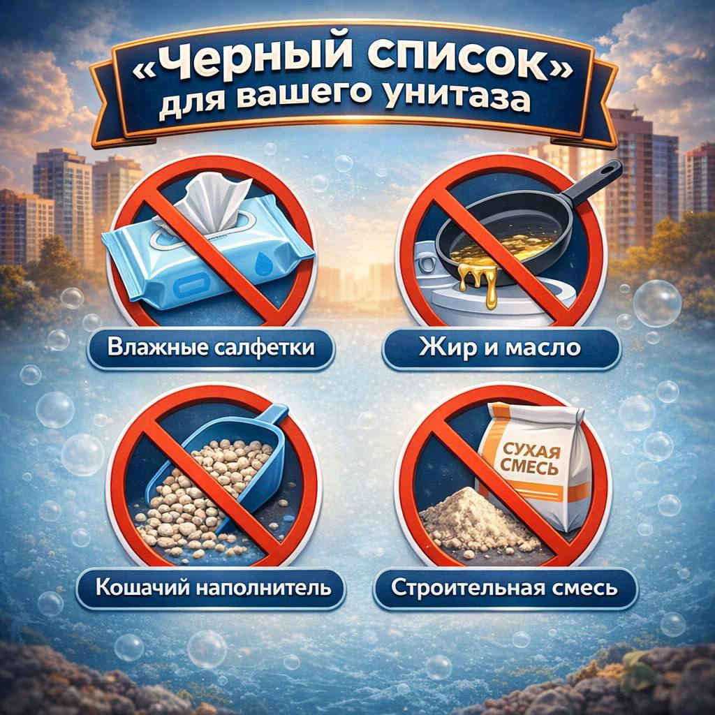 Напоминаем, что категорически запрещено смывать в канализацию: